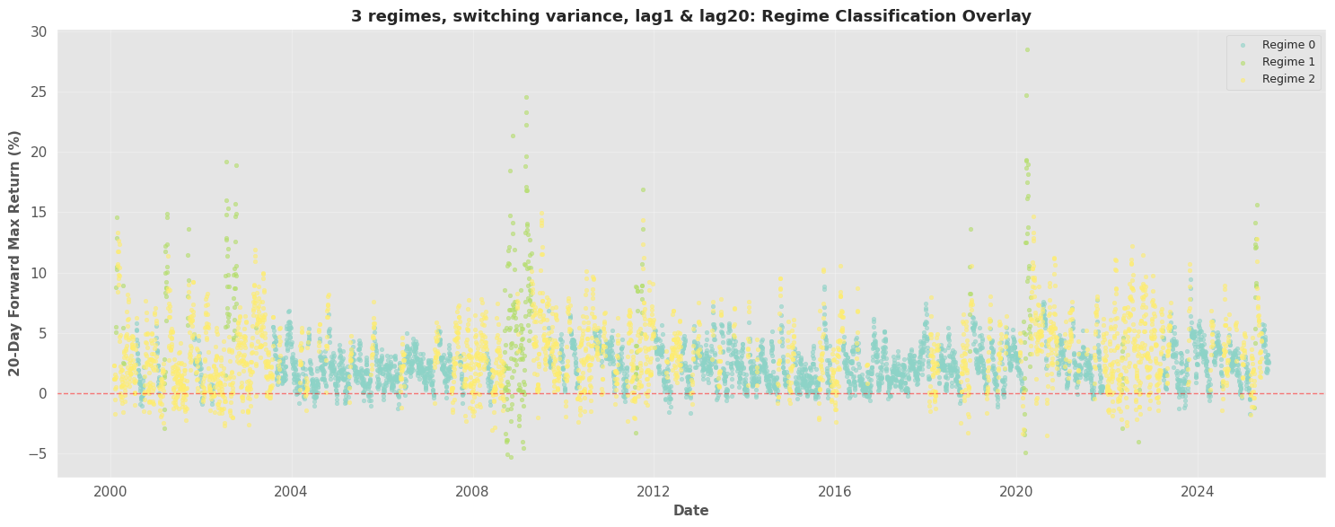 - This pipeline fits regimes on a forward-looking target (20-day forward max return).